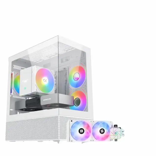 Kombinacija najnovejše 14. generacije Intel procesorja in močne grafike RX 9060 XT. Belo vodno hlajenje in ohišje s steklenimi paneli ustvarjata moderen in čist izgled, ki bo krasil vašo pisarno ali igralno sobo.