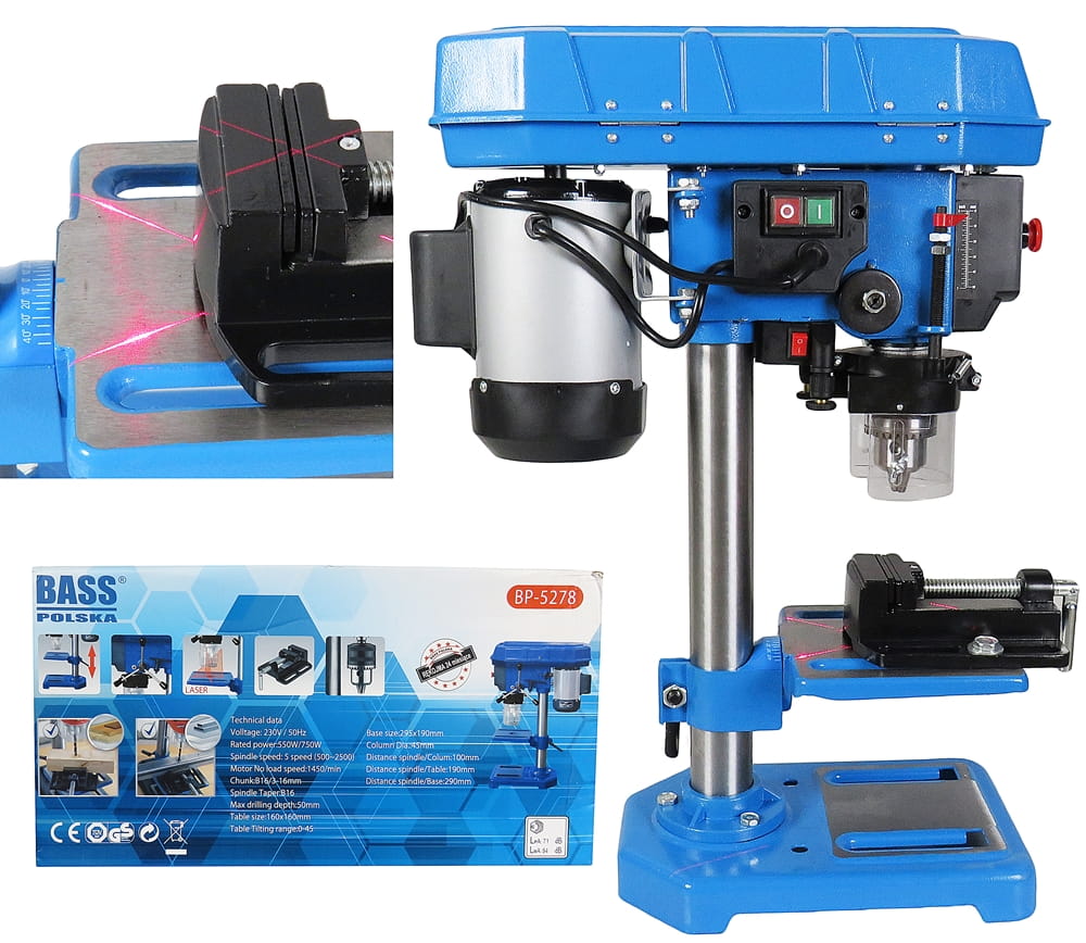 Stebrični vrtalnik, ki ga poganja klinasti jermen in je opremljen z zmogljivim indukcijskim motorjem 750 W, ki zagotavlja optimalne delovne parametre.
