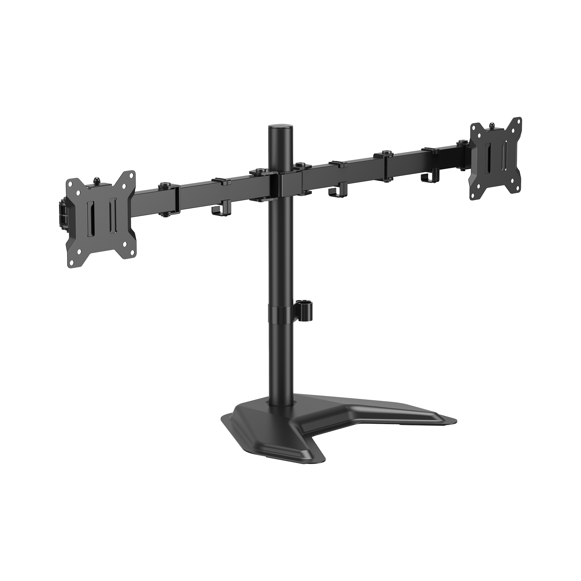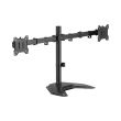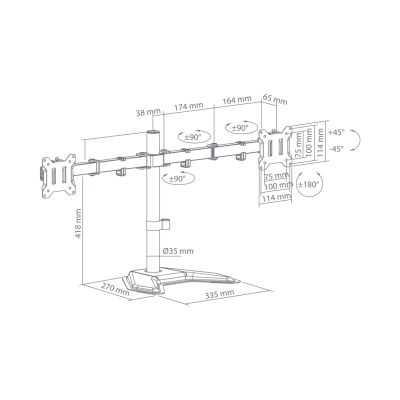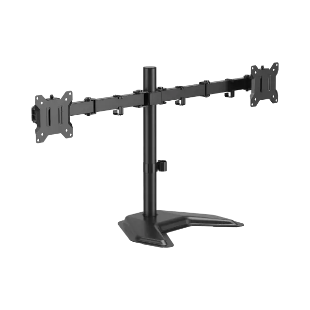 Število zaslonov: 2 Najmanjša velikost VESA: 75x75 Največja velikost VESA: 100x100 Nosilnost (kg): 10 na monitor (skupaj 20 kg) Najmanjša velikost zaslona: 17'' / 43 cm Največja velikost zaslona: 32'' / 81 cm Navpični nagib: +45° / -45° Vodoravno vrtenje: +90° / -90° Vrtenje zaslona: +180°/ -180° Razpon rok (mm): 376 Višina podporne cevi (mm): 418 Material: jeklo/plastika Barva: črna Končna obdelava: prašno barvanje Za ukrivljene zaslone: ne Vodila za kable: da Snemljiva plošča VESA: da Namestitev: stojalo / miza Dimenzije (mm): 866x270x454