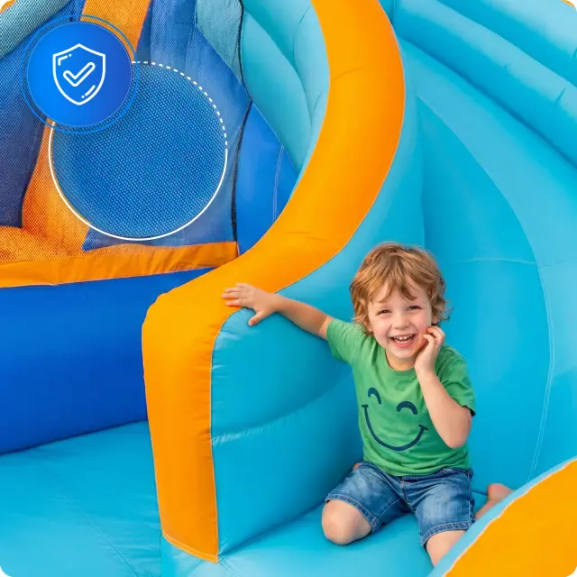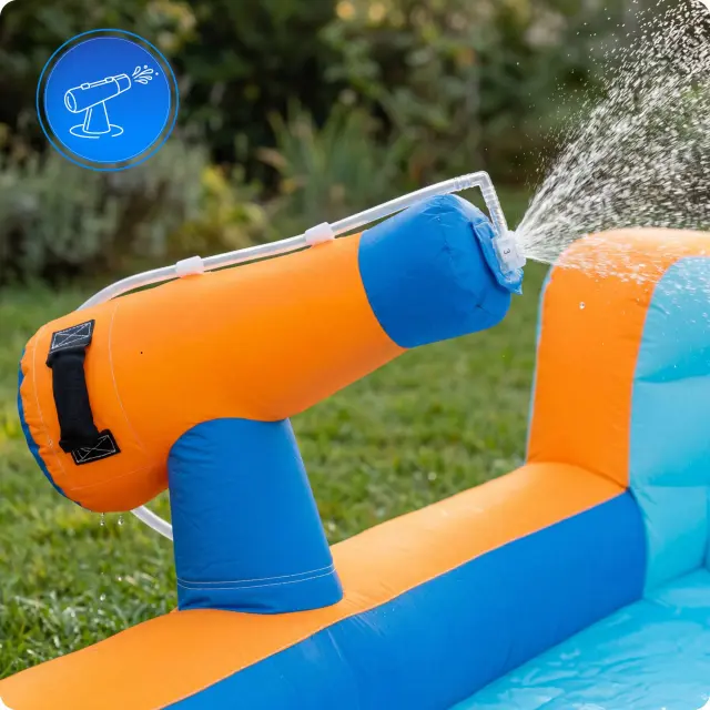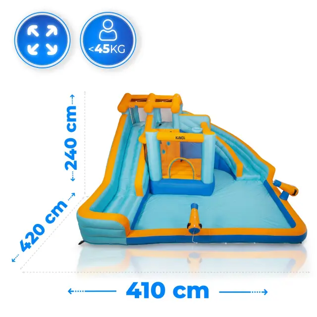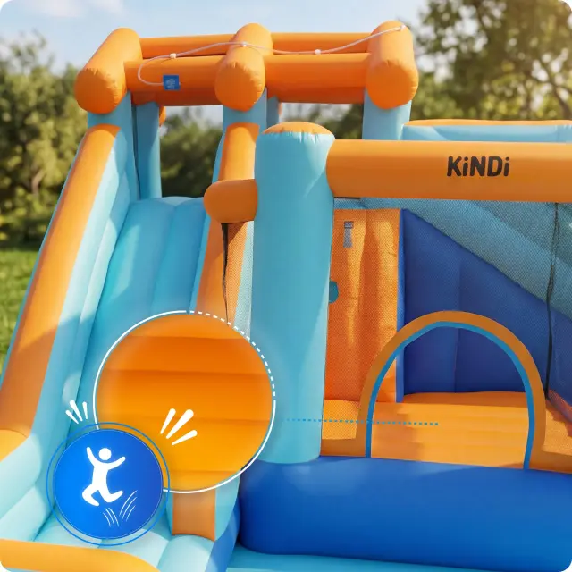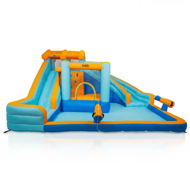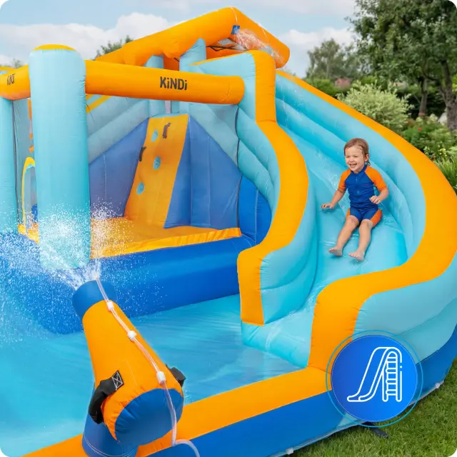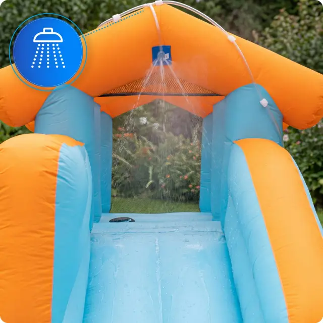 Model z dvojnim toboganom in veliko vodno cono spredaj ustvarja popoln prostor za aktivno igro. Združuje skakanje in spuščanje, zato lahko več otrok uživa hkrati.