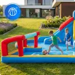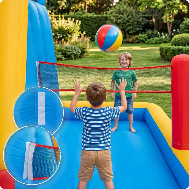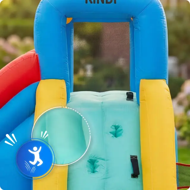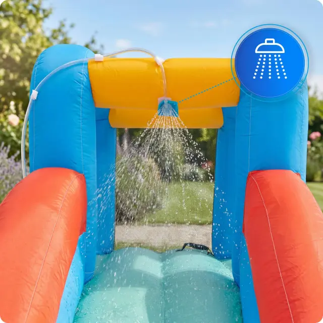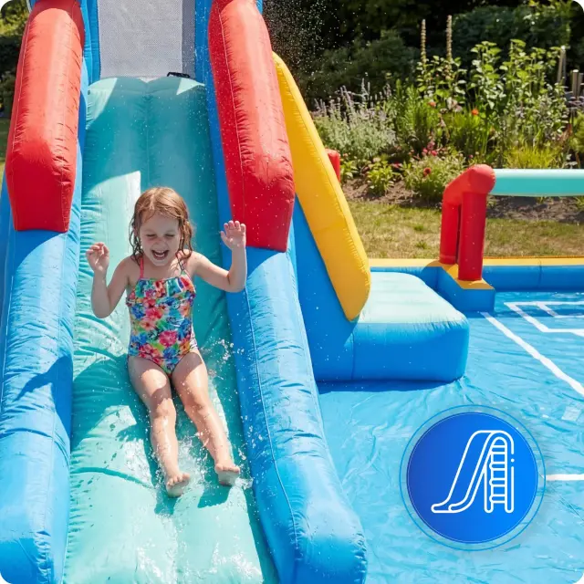 Razširjen model za vrt, ki združuje visoko vodno tobogansko površino in veliko športno cono za skupinsko igro. Namenjen otrokom, ki poleg skakanja in spuščanja uživajo tudi v tekmovanju in aktivnem gibanju v skupini.