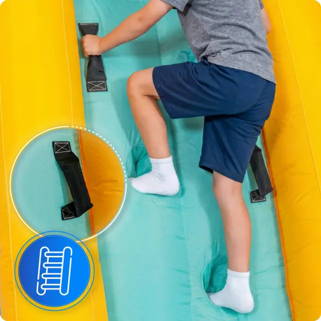 Ojačan ročaj in odprtine za stopala omogočajo varen vzpon in razvoj ravnotežja ter koordinacije.