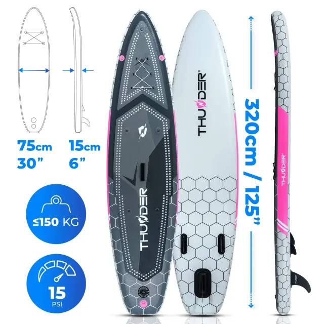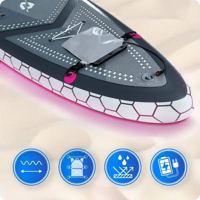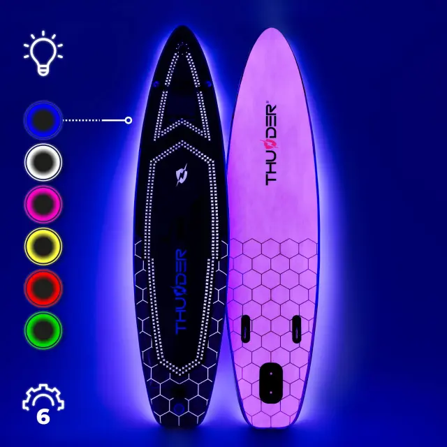 Model THUNDER® 320 LED je edinstvena SUP deska z vgrajeno RGB LED osvetlitvijo, ki ustvarja spektakularne efekty na vodi, povečuje vidljivost in prinaša popolnoma novo doživetje veslanja – podnevi in ponoči.