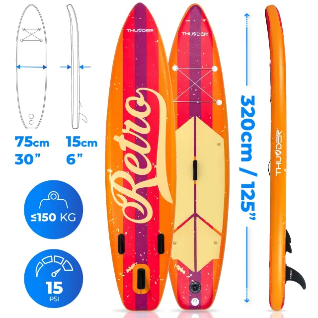 Napihljiva SUP deska 320 × 75 × 15 cm – set z veslom, sedežem, torbo in pumpko THUNDER® RETRO