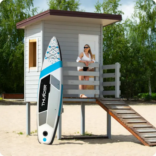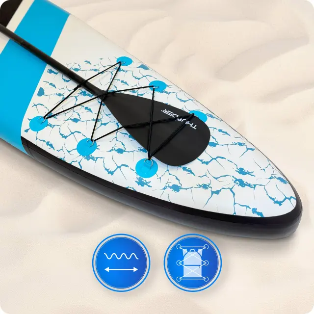 Napihljiva SUP deska – 320 cm stabilnosti, udobja in popolne vsestranskosti Napihljiva SUP deska dolžine 320 cm je odlična izbira za rekreativno veslanje, družinske izlete in daljše ture. Zahvaljujoč 15-centimetrski debelini, široki zasnovi ter napredni konstrukciji drop-stitch nudi izjemno stabilnost, togost in zanesljivo uporabo za začetnike in izkušene veslače. ⭐ Ključne lastnosti ✔ Stabilna in vzdržljiva konstrukcija – Tehnologija I-Drop Stitch (IDC) za maksimalno togost – Kompozitna površina z 5 mm EVA proti zdrsu – Izjemna trpežnost in odpornost na obrabo ✔ Dimenzije in nosilnost – 320 × 75 × 15 cm – Nosilnost: do 150 kg – Kompletna teža: ok. 13 kg ✔ 2v1: SUP + kajak – Možnost montaže sedeža (če je v kompletu) – D-ringi za enostavno pritrditev opreme ✔ Hitro in preprosto napihovanje – Dvosmerna pumpa za hitro pripravo – Priporočljiv tlak: 15 PSI – Visokotlačni ventil za popolno tesnjenje ✔ Komplet dodatkov (odvisno od modela) – Nastavljivo veslo (pribl. 162–215 cm) – Sedež (če je priložen) – Torba/rucksack za prenašanje – Smernik – Varnostna vrvica (leash) – Komplet za popravilo ⭐ Udobje in varnost – Nedrseča EVA površina za popoln oprijem – Elastični sprednji prtljažnik za osebne predmete – 3 plavuti za stabilizacijo in boljšo vodljivost – Varnostna vrvica prepreči odmik deske ob padcu ⭐ Za koga je primerna? Sup 320 cm priporočamo za: – začetnike, rekreativce in družine – uporabnike do 150 kg – mirne vode, jezera, reke in morje – daljše ture in vsakodnevno rekreacijo – SUP + kajak kombinacijo ⭐ Zakaj izbrati SUP dolžine 320 cm? – optimalno razmerje med stabilnostjo in hitrostjo – primeren za vse starosti in stopnje znanja – vsestranska uporaba: sprostitev, trening, izleti – enostavno shranjevanje in prenašanje.
