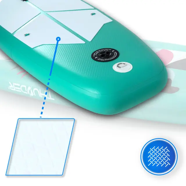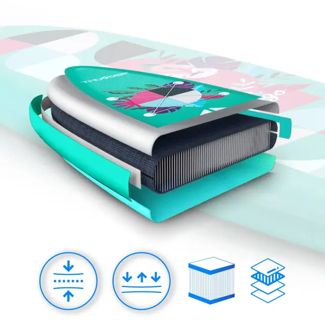 • Kompozitna UAL plast z debelim ojačanim PVC-jem je prevlečena s 5 mm EVA peno mehke, udobne in protizdrsne teksture, ki zagotavlja izjemen oprijem in stabilnost.