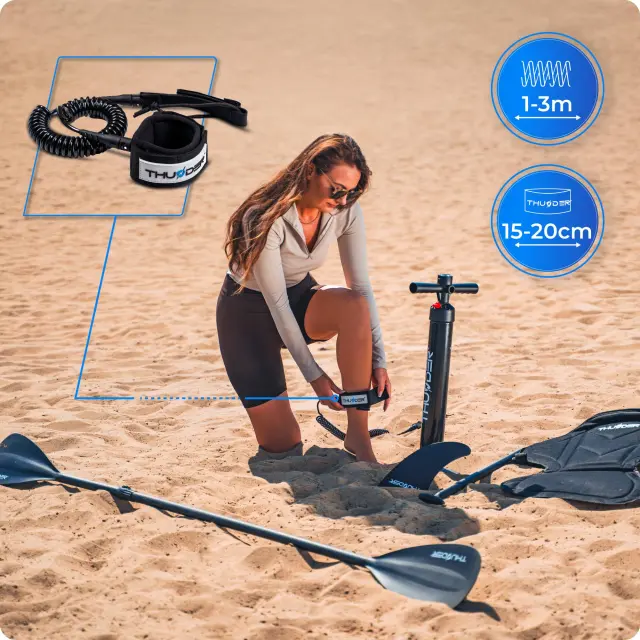 • Dodatno varnost zagotavlja varnostna vrvica za gleženj. Tudi če padete v vodo, deska ne bo odplavala daleč.