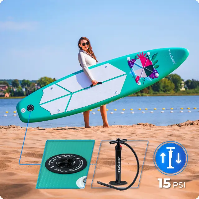 • Deska je opremljena z učinkovito dvosmerno tlačilko, ki pospeši napihovanje – zrak se črpa pri potisku in dvigu bata. Trden ventil omogoča hitro in varno polnjenje do optimalnega tlaka 15 PSI.