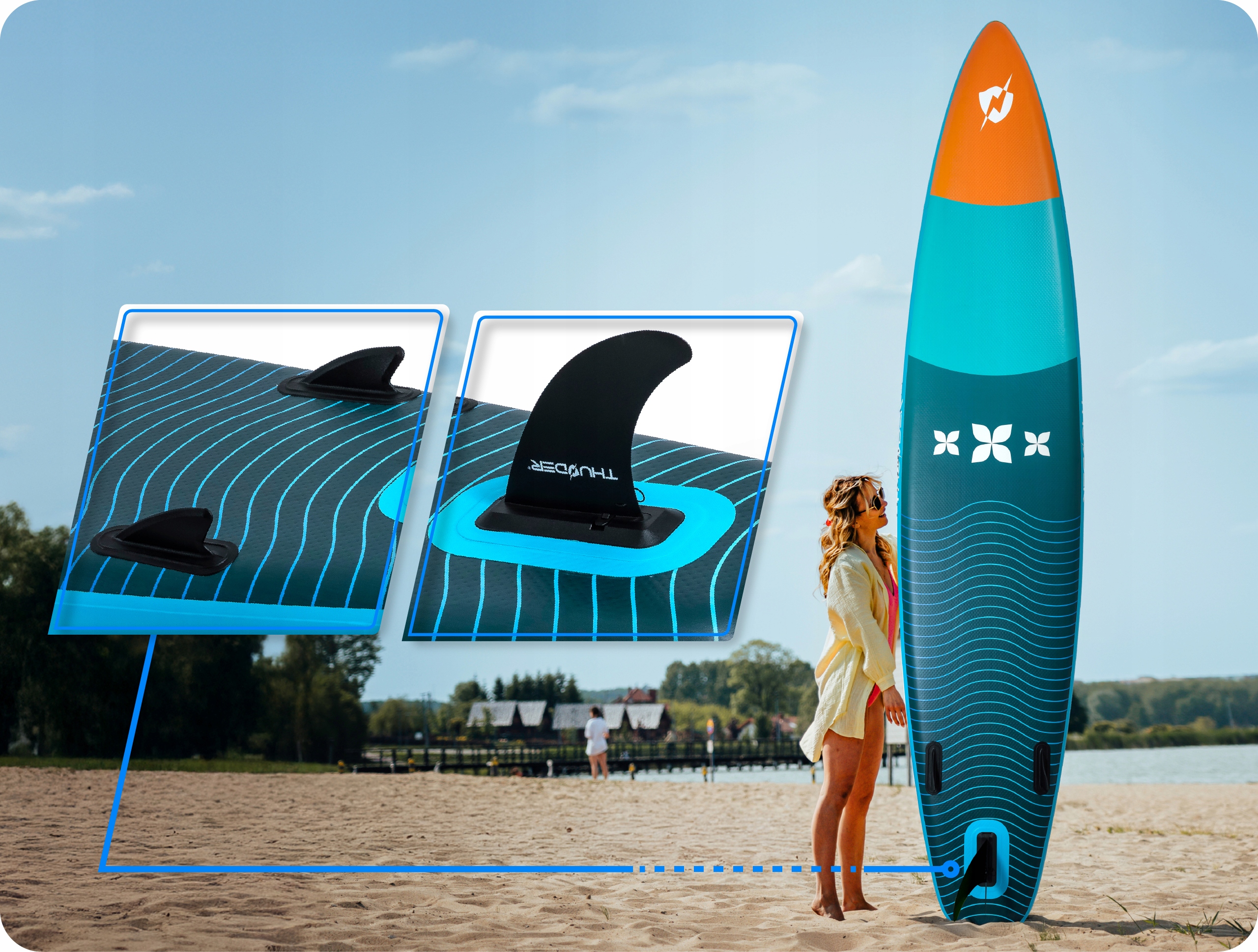 Zahvaljujoč trem plavutem na spodnji strani deska nudi odlično vodljivost in hitrost, kar olajša nadzor in upravljanje.