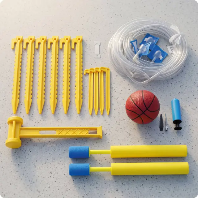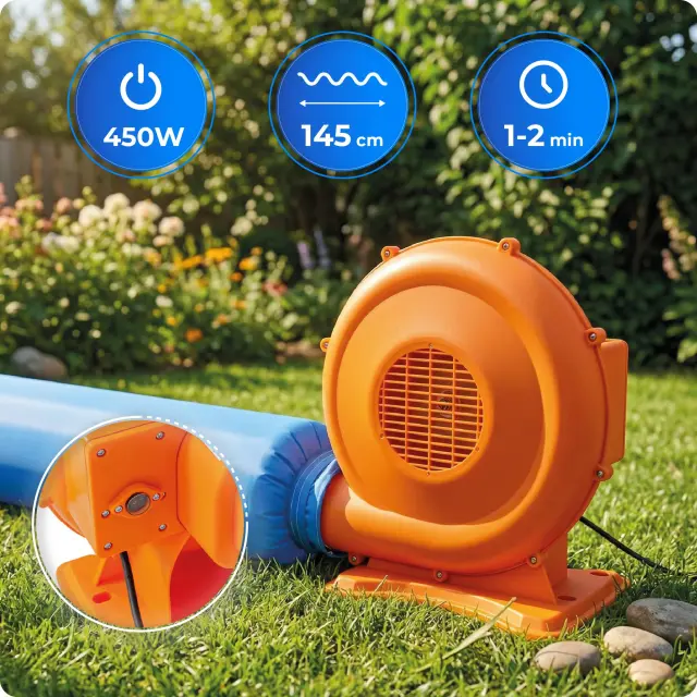 Igrišče deluje s sistemom stalnega napihovanja, kjer puhalo neprekinjeno vzdržuje ustrezen tlak zraka. Postavitev in napihovanje trajata le 1–2 minuti.