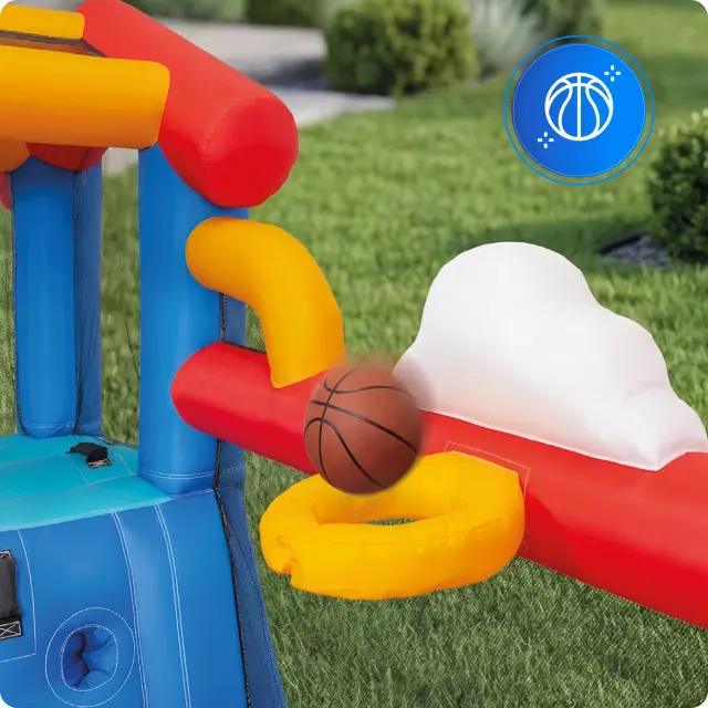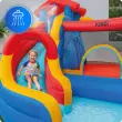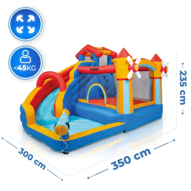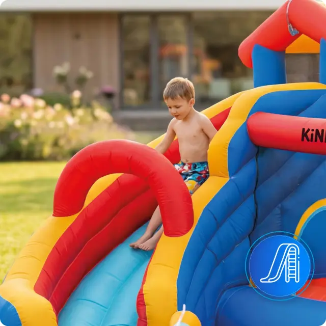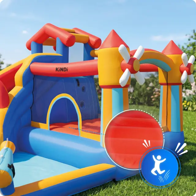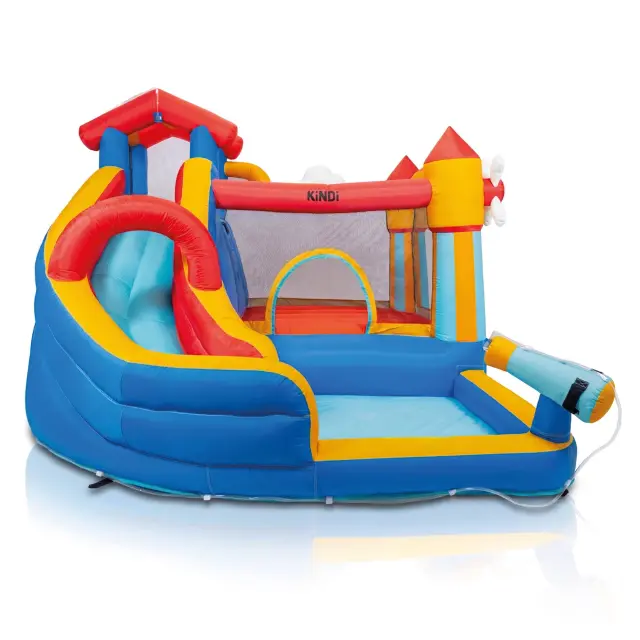 KiNDi DPZ003 je napredno vrtno igrišče, ki združuje skakalno površino, visok tobogan in velik sprednji bazen. Barvita in dinamična zasnova pritegne pozornost ter ustvari pravo cono aktivne zabave. Primerno za domačo uporabo – idealno za pomladno-poletno sezono. V suhem načinu lahko bazen služi kot prostor za pristanek ali bazen z žogicami.