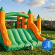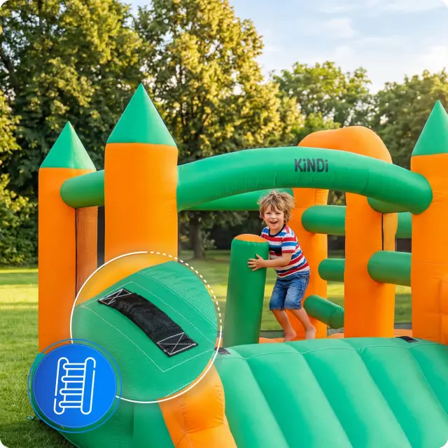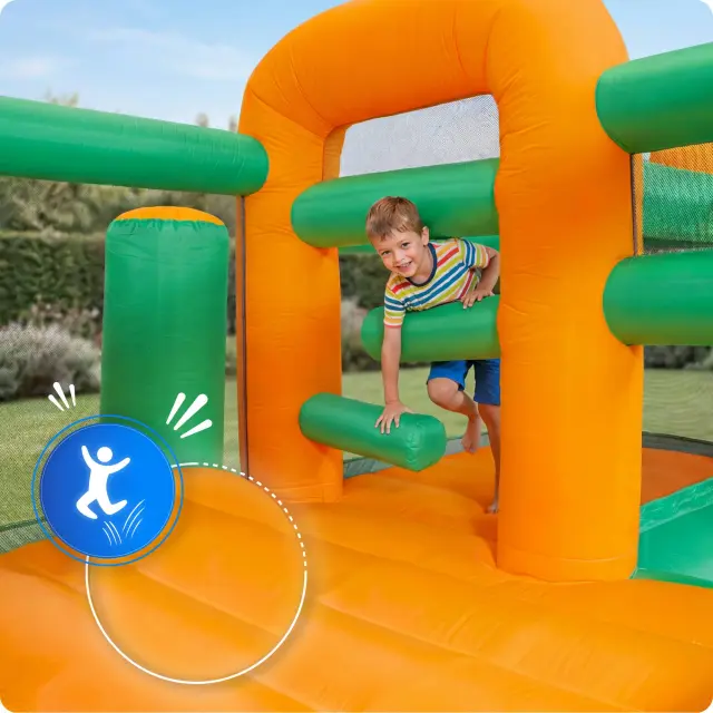Razširjen vrtni model, ki združuje klasično skakalno površino z dodatnimi aktivnimi conami ter širokim sprednjim toboganom. Dinamična barvna zasnova jasno loči igralne cone, kar omogoča otrokom, da hkrati skačejo, plezajo in se spuščajo.