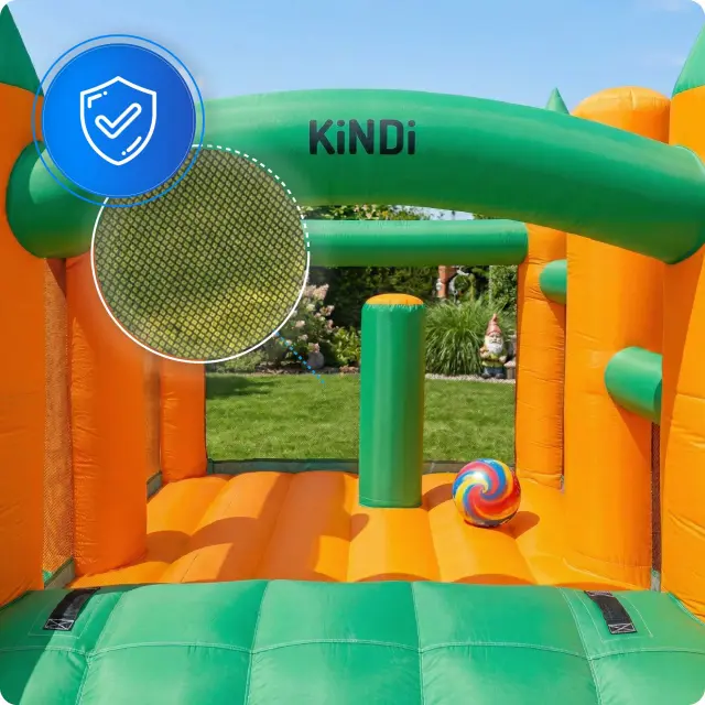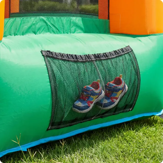 Osrednji skakalni prostor je obdan z visoko mrežo, ki preprečuje padce in omogoča stalen nadzor staršev.