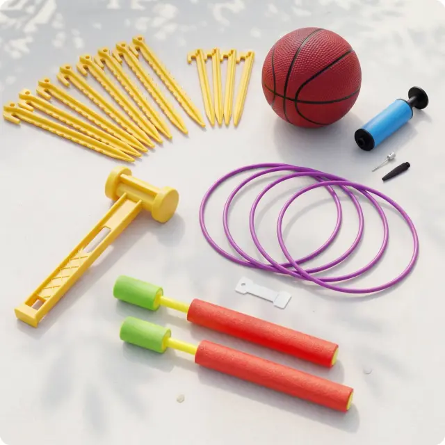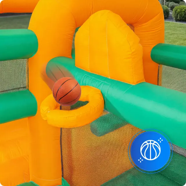 Vgrajen koš za košarko in igralni elementi v obliki ovir ter ciljev spodbujajo gibanje, koordinacijo in še več zabave.