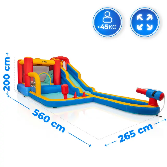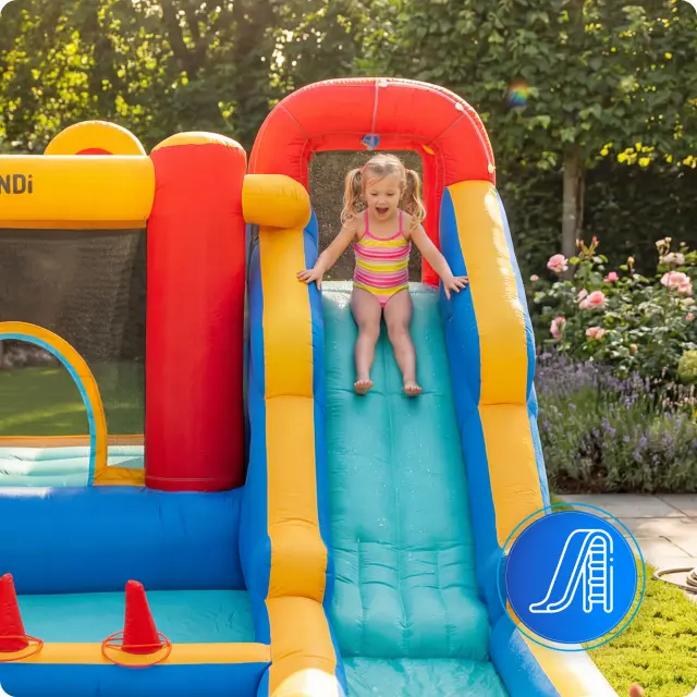 Dinamičen vrtni komplet z visokim toboganom in podaljšano drsno stezo, ki se konča z veliko vodno površino. Združuje prostor za skakanje z vznemirljivim dolgim spustom.