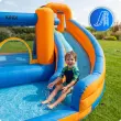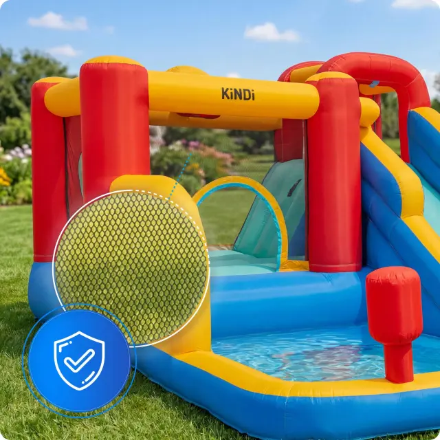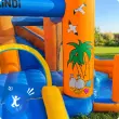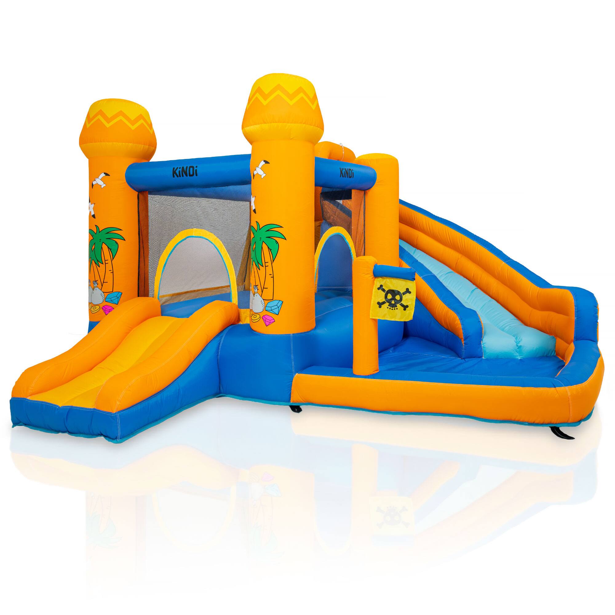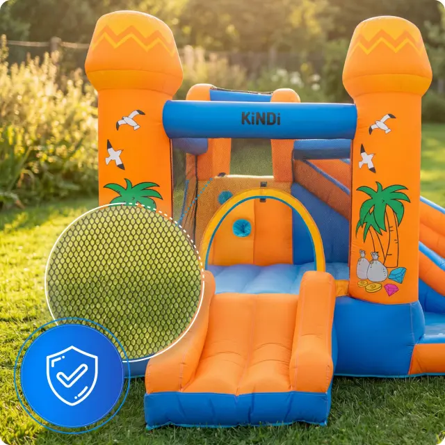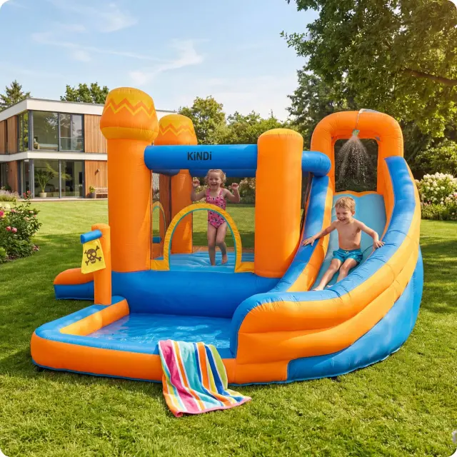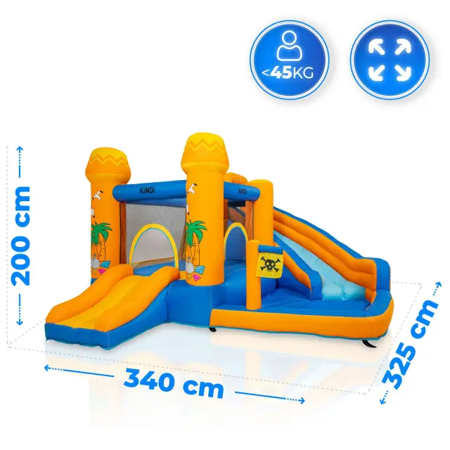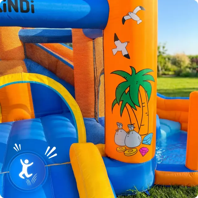 KiNDi DPZ012 je velik vrtni model v tropskem, poletnem dizajnu, ki združuje skakalno površino, dva tobogana in veliko vodno območje. Barvita konstrukcija z motivi palm ustvarja občutek pravega zabaviščnega parka na vašem vrtu. Idealna izbira za poletne dni in aktivno igro na prostem.