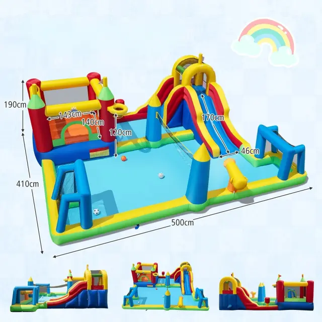 Celoletno vodno igrišče: spremenite svoj vrt v mini vodni park: dolg vodni tobogan, prostorna skakalna cona, plezalna stena z ročaji, vreča za udarce, plitvo veslo z vodnim topom in 3 igre (košarka/nogomet/volejbal). Uporablja se lahko tako na suhem kot na mokrem, saj otroke zaposli od pomladi do jeseni.