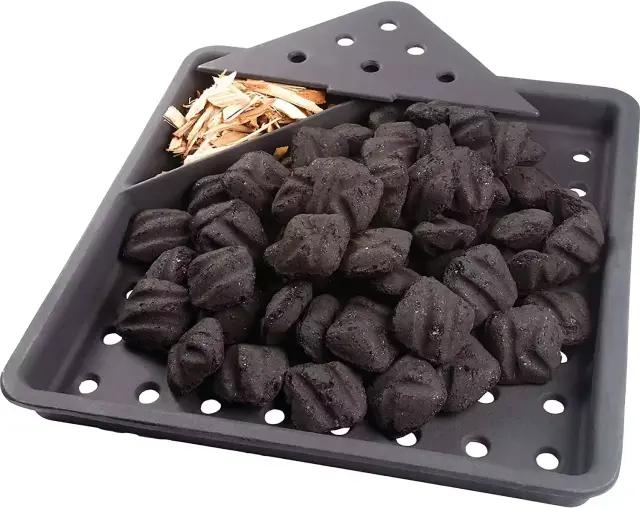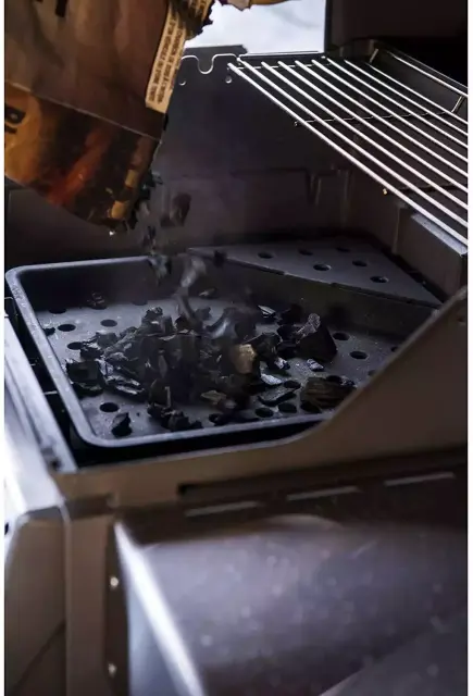 Litoželezni vložek za oglje s prostorom za sekance, ki vam omogočajo dimljenje. Oglje enostavno prižgete s plinskim gorilnikom žara.