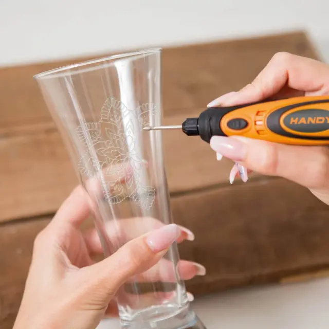Ustvarjalno orodje, ki ga je mogoče uporabiti s skoraj vsakim materialom. Z diamantno glavo lahko vgravirate vzorce, besedilo na steklo, les, kovino, plastiko, keramiko, ploščice, karton in druge materijale. Njegova uporaba je izredno razširjena, meja je le vaša kreativnost! Zahvaljujoč zasnovi z Li-ION akumulatorjem ga lahko uporabljate dlje časa na mestih, kjer ni na voljo nobenega vira energije. Dodatna oprema s 4 glavami.