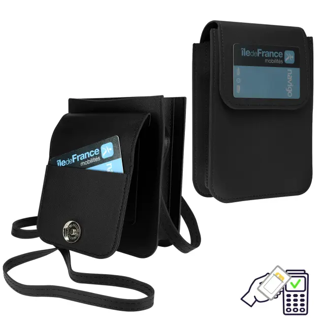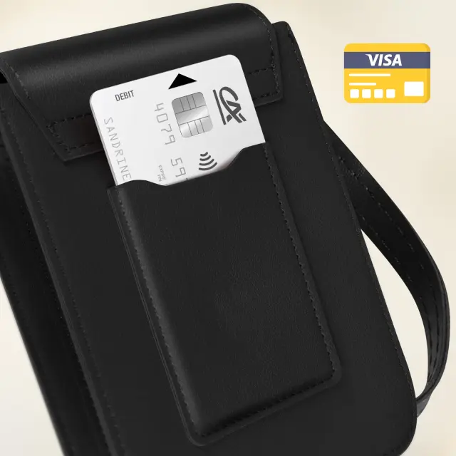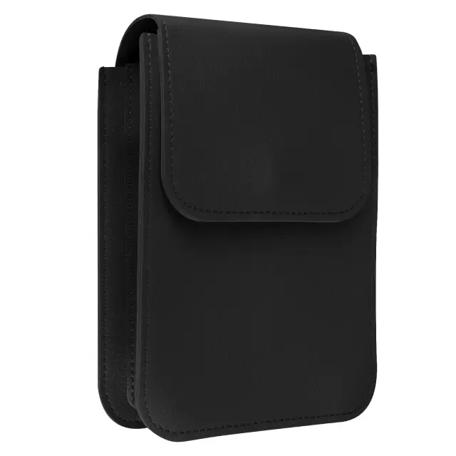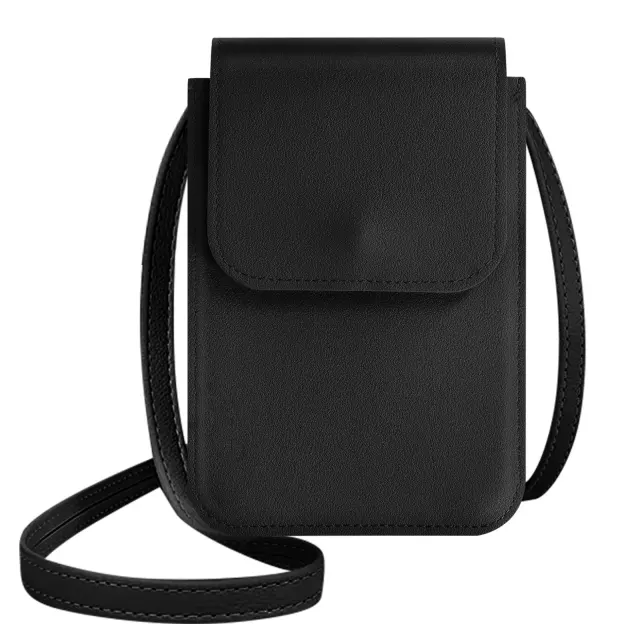 Naramna torba iz crne imitacije usnja za enostavno prenašanje pametnega telefona. Ima predal za shranjevanje na zadnji strani, ki vam omogoca, da imate svojo kartico blizu. Njegov 135 cm dolg trak omogoca nošenje kot naramnico ali okoli vratu.