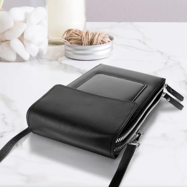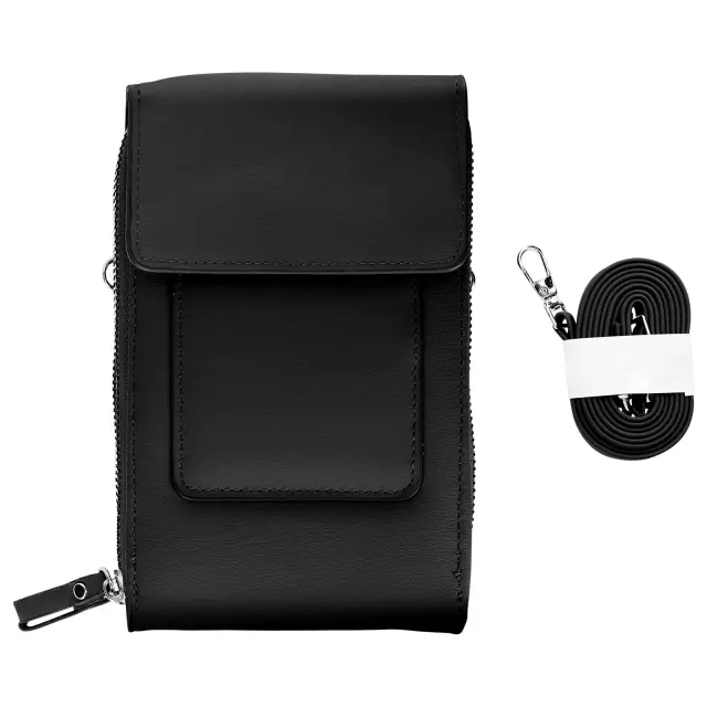 Naramna torba za pametni telefon v crni imitaciji usnja. Ima vec predelkov in sprednji žep za vaš telefon in osnovne stvari. Njegov odstranljiv in nastavljiv pas od 70 do 130 cm omogoca enostaven transport in stil.