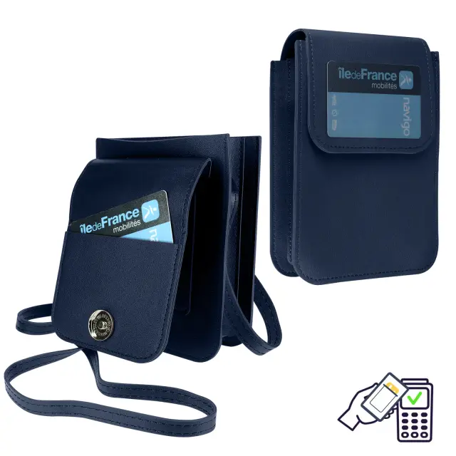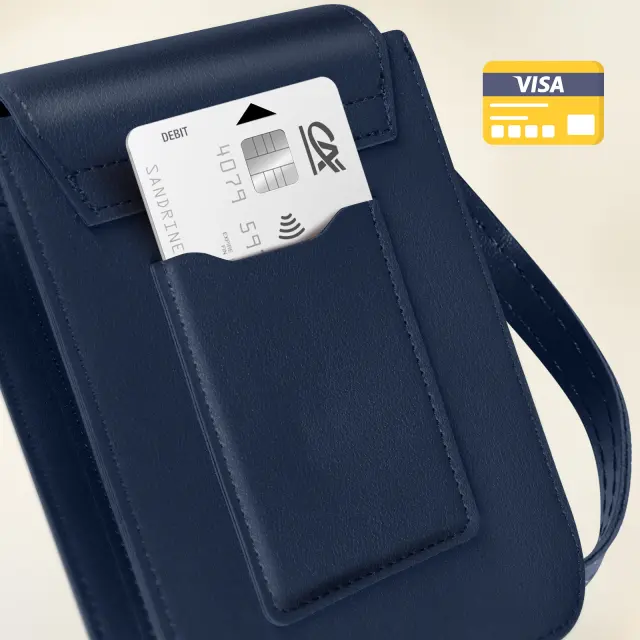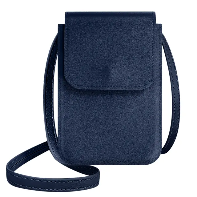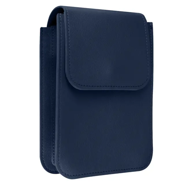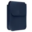 Naramna torba iz polnocno modrega umetnega usnja za enostavno prenašanje pametnega telefona. Ima predal za shranjevanje na zadnji strani, ki vam omogoca, da imate svojo kartico blizu. Njegov 135 cm dolg trak omogoca nošenje kot naramnico.