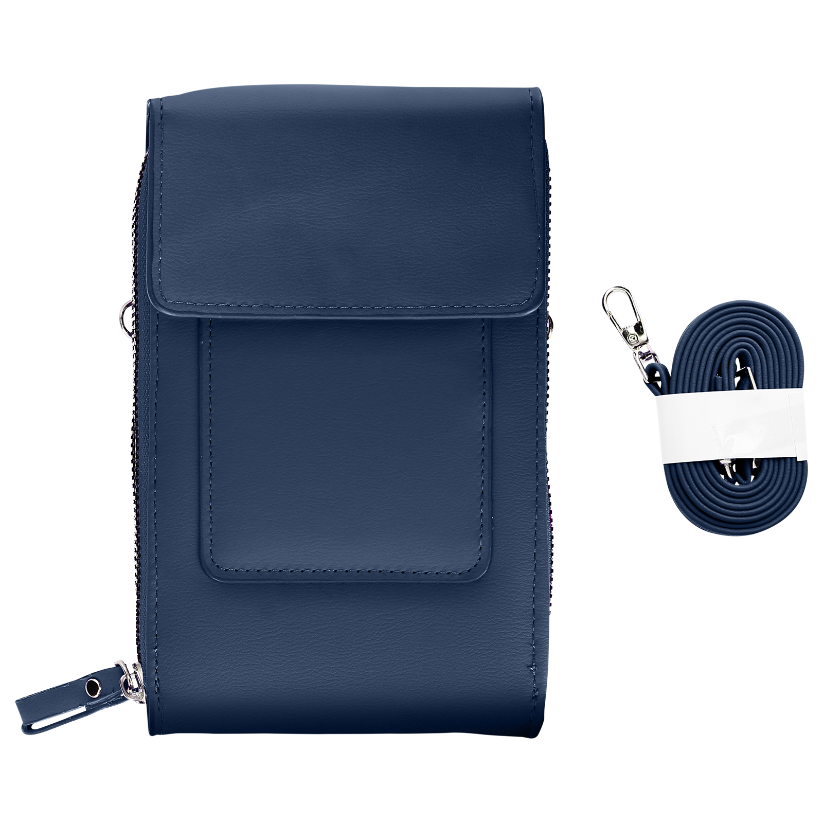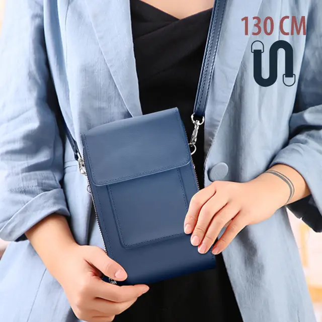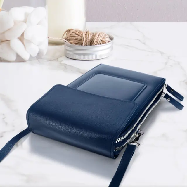 Torbica za naramnico za pametni telefon iz polnocno modrega umetnega usnja. Ima vec predelkov in sprednji žep za vaš telefon in osnovne stvari. Njegov odstranljiv in nastavljiv pas 70 do 130 cm omogoca enostaven transport.