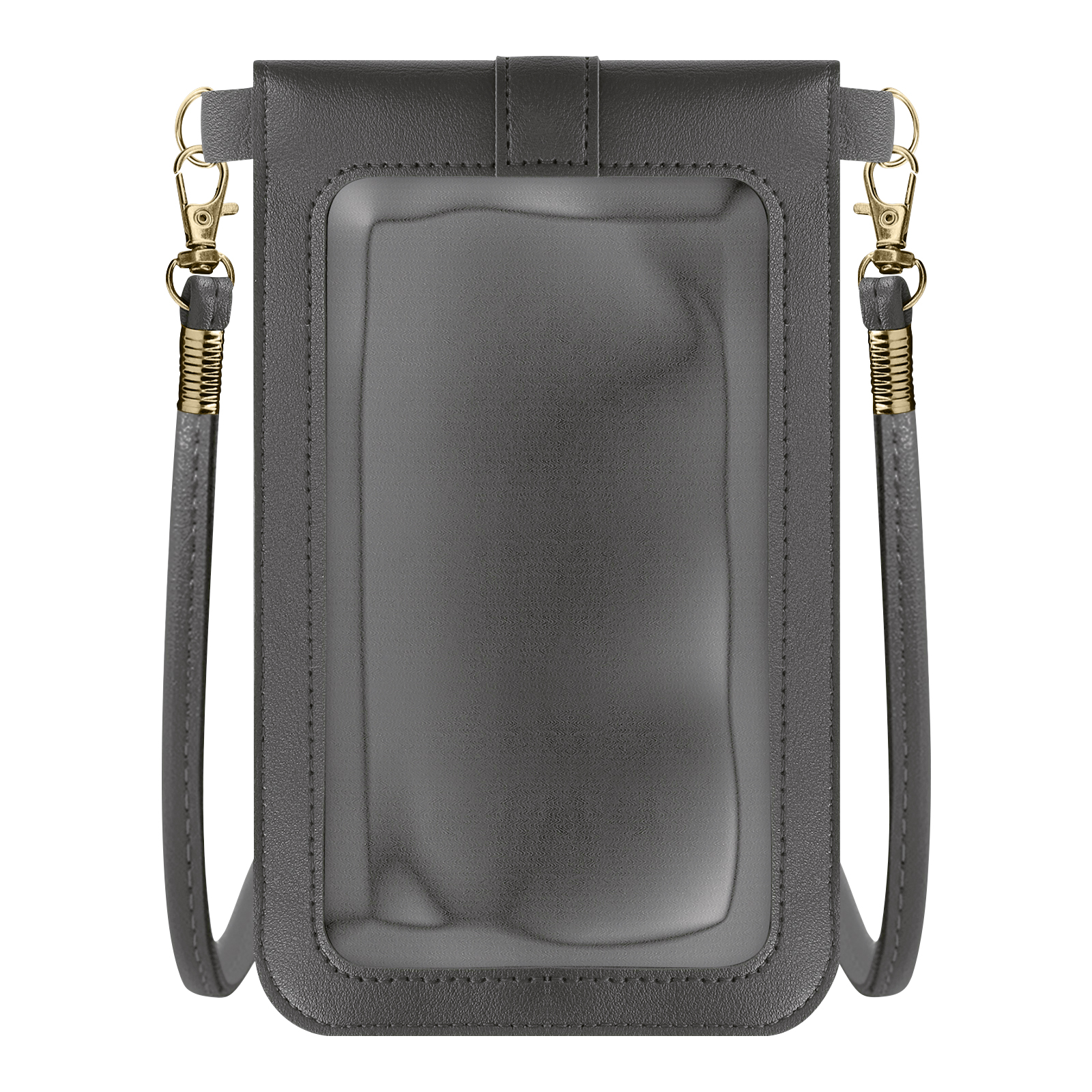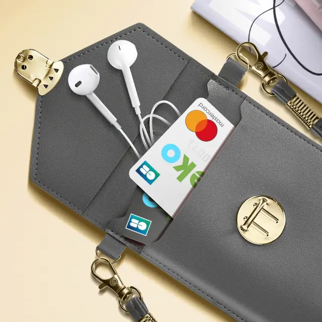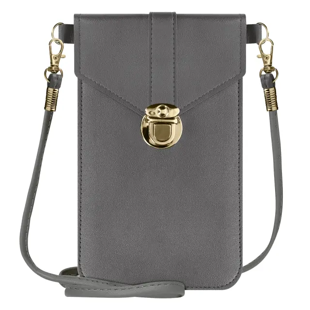 Temno siva univerzalna naramna torba za enostavno shranjevanje in prenašanje vašega pametnega telefona ter razlicnih predmetov. Oblikovan je iz umetnega usnja in ima zaponko na zaponko. Torbica s prozornim in otipljivim okencem. Trak 1,40 m.