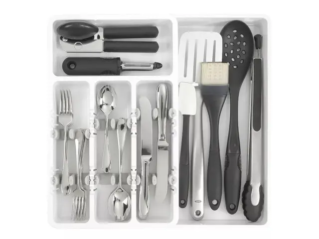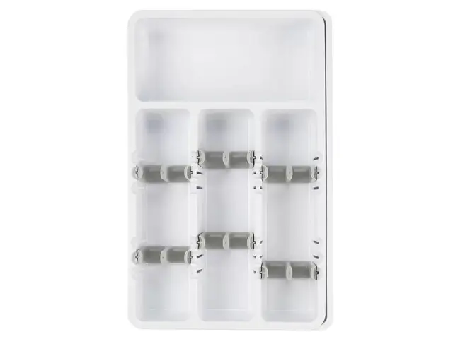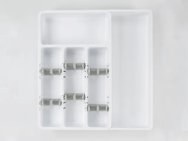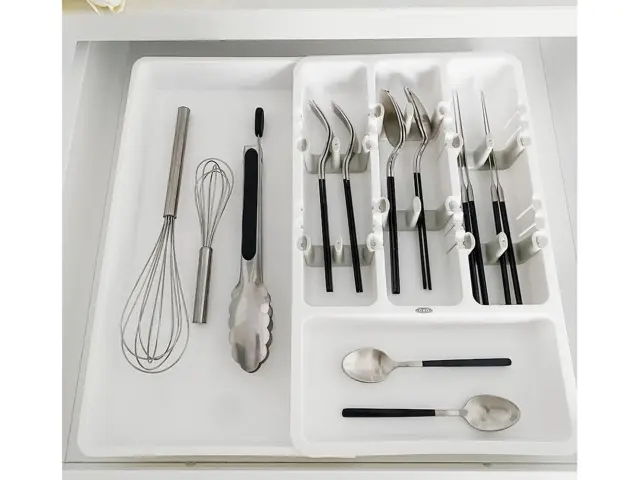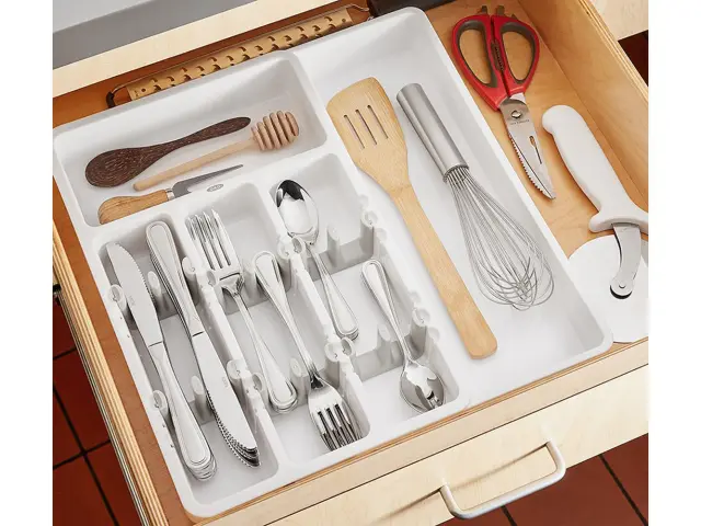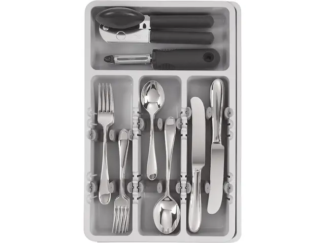 Zahvaljujoč skrbno oblikovanim razdelitvam in predelkom vložek omogoča optimalno razporeditev jedilnega pribora na prava mesta. Vsaka vrsta jedilnega pribora bo našla svoje mesto, kar olajša njihovo ločevanje in organizacijo. Zdaj bodo vse vilice skupaj, žlice ločene od nožev, drobni pripomočki, kot so odpirači za steklenice in zamaški, pa bodo imeli svoj ločen prostor. Prekate lahko enostavno prilagodite svojim potrebam.
