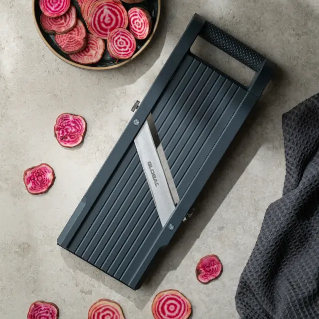 Udoben odprt ročaj, nedrseča gumijasta podlaga in ščitnik za prste zagotavljata stabilno in varno uporabo med pripravo. Priporočljivo je ročno pranje, saj lahko pranje v pomivalnem stroju poškoduje rezilo in njegov rezalni rob. Če je rezilo topo ali poškodovano, ga lahko odvijete in nabrusite na brusnem kamnu. Lahko ga tudi odnesete k izkušenemu brusilcu, da ga ponovno nabrusi.