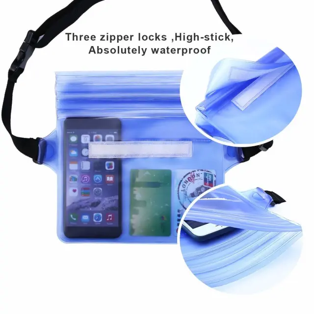 Prostor za mobilnike in še več: torba je nepremočljiva do globine 15 metrov. Vreča je odporna tudi na pesek, umazanijo in blato. Mehak material omogoča uporabo pametnega telefona brez odpiranja ohišja. Med kopanjem lahko berete e-pošto, odgovarjate na besedilna sporočila ali brskate po spletu. Torba za okoli pasu ustreza večini pametnih telefonov, prostor pa je tudi za druge stvari, kot so denar, osebne izkaznice in ključi.