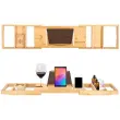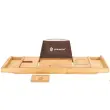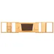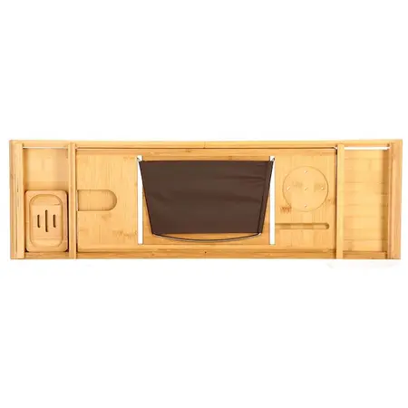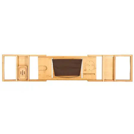 Kopalniška polica iz bambusa bo poskrbela, da bodo trenutki v kopalnici še prijetnejši. Naša nastavljiva podloga dolžine 75-110,5 cm je izdelana iz naravnega materiala in ima lakirano površino, zaradi česar je vodoodporna in odporna proti plesni. Zaradi rebrastega dizajna je polica funkcionalna in estetska. Ta kopalniški dodatek bo uporaben za odlaganje različnih higienskih pripomočkov (gobice, tekočine, geli in druga kozmetika), dekoracije, kot so sveče ali dišave za kamin, pa tudi drugih izdelkov, ki jih želite zaščititi pred stikom z vodo, kot so knjige, telefoni. ali tablete. Varnost zagotavljajo posebni predali za telefon in skodelico, držalo za kozarec za vino in stojalo s 3 različnimi koti nagiba, kamor lahko postavite tablico ali knjigo. Dodatno priloženo: podstavek za milo in 2 mobilni posodici, kamor lahko postavite brisačo ali stekleničko šampona. Zahvaljujoč oblogi za kopalno kad je vse na dosegu roke in vaša kopel postane bolj sproščujoča!