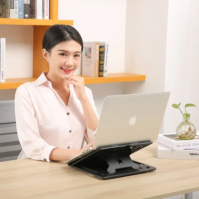 Ergonomska oblika: To stojalo za prenosnik dvigne zaslon na udobno višino gledanja, kar spodbuja boljšo držo in zmanjšuje obremenitev vratu in hrbta. Njegova ergonomska oblika pomaga ustvariti bolj udobno in učinkovito delovno mesto.