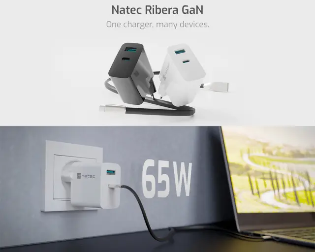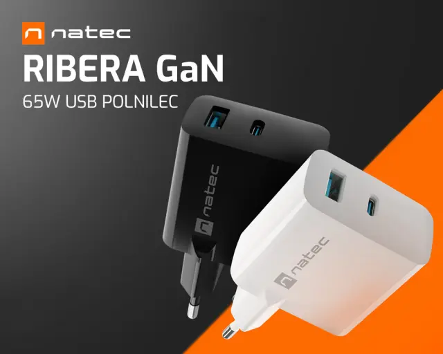 Hitrejše polnjenje in manjša poraba energije! Spoznajte Natec Ribera GaN 65W – USB polnilec z več vhodi, s katerim lahko polnite / napajate 2 napravi hkrati (tudi izbrani prenosniki, ki podpirajo standard PD – Power Delivery).