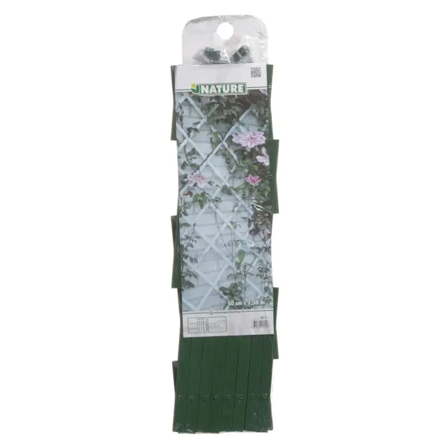 Naj bodo vaši prelepi sroboti, vinske trte, glicinije ali vrtnice vzpenjavke razporejene na tej Nature oporni mreži!  Ta oporna mreža za vzpenjalke, ki je visoka 150 cm, bo vašim rastlinam omogočila, da ustvarijo slikovito naravno vzdušje na vašem vrtu. Oporna mreža je izdelana iz trpežnega PVC-ja, odpornega na vremenske vplive, delilnik v priloženem kompletu za namestitev pa vam omogoča, da mrežo namestite ločeno od stene in tako olajšate rast in vzdrževanje rastlin.Barva: ZelenaMaterial: PVCDimenzije: 50 x 0,3 x 150 cm (D x Š x V)Vključno s kompletom za namestitevNastavljiva širinaIdealno za srobote, vinske trte, vrtnice vzpenjalke, itd.Rastlinam vzpenjavkam omogoča boljšo rastDekorativni dodatek za steno 409349