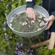 Praktična zasnova: Sito za zemljo je lahko in s svojo okroglo obliko s premerom 37 cm odlično paše v roko, zaradi zaobljenega gladkega roba pa je varno za uporabo.