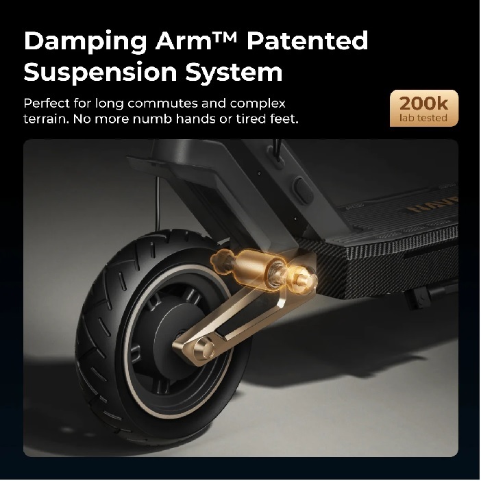 Sistem Damping Arm™ vzmetenja spredaj in zadaj učinkovito absorbira tresljaje in udarce. Vožnja je zato stabilna in udobna tudi na neravnih cestah, tlakovcih ali makadamu.