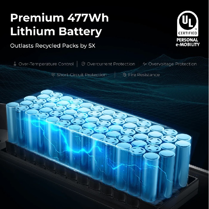 Zmogljiva baterija 48 V / 10.2 Ah (477 Wh) omogoča do 60 km dosega, kar je idealno za vsakodnevne poti v službo, po opravkih ali za daljše mestne vožnje. Pametni sistem upravljanja baterije (BMS) skrbi za varno in učinkovito delovanje.