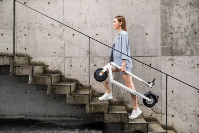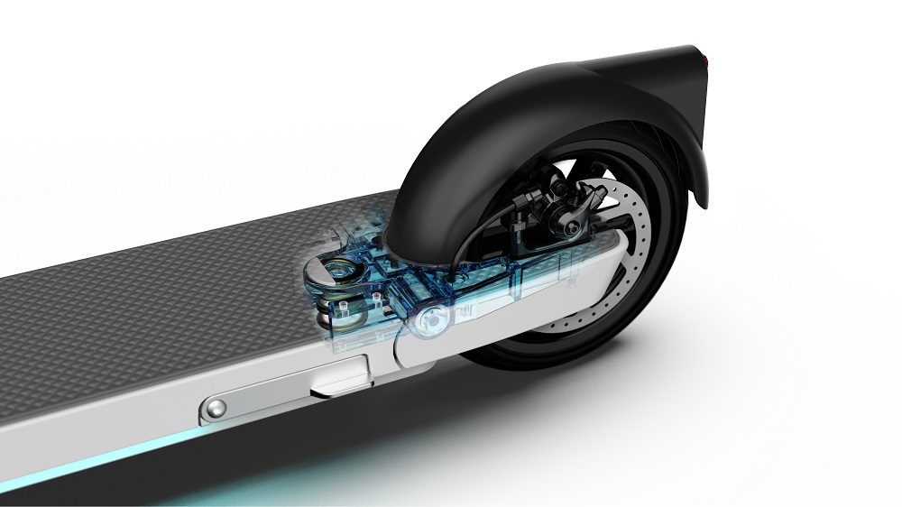 Za večje udobje poskrbi skriti amortizer na zadnjem delu skiroja, ki vašo vožnjo naredi bolj stabilno in udobno, tudi na neravnem terenu. Skiro je zgrajen iz lahkega in trpežnega aluminija, katerega zložite v samo 1 sekundi z samo enim klikom v vodoraven položaj. Vodoraven položaj zloženega skiroja omogoča lažji transport. Skiro lahko odklenete/zaklenete na dva načina, z uporabo NFC ali pa aplikacije Okai.