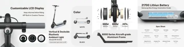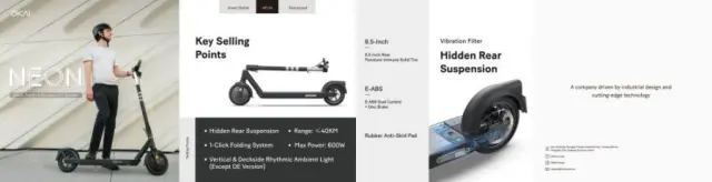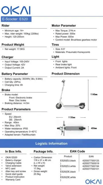 Električni skiro Okai NEON ES20 bel, modernega designa in kakovostne izdelave, ki boste z enim polnjenjem litijonske baterije lahko prevozili do 40 km. Skiro z motorjem maksimalne moči do 600 W, doseže hitrost do 25 km/h in lahko prenaša vzpon do 20% naklona. Skiro je opremljen s 21,59 cm (8,5") pnevmatikam, dvojnim zavornim sistemom in vodoodporen z zaščito IP55.