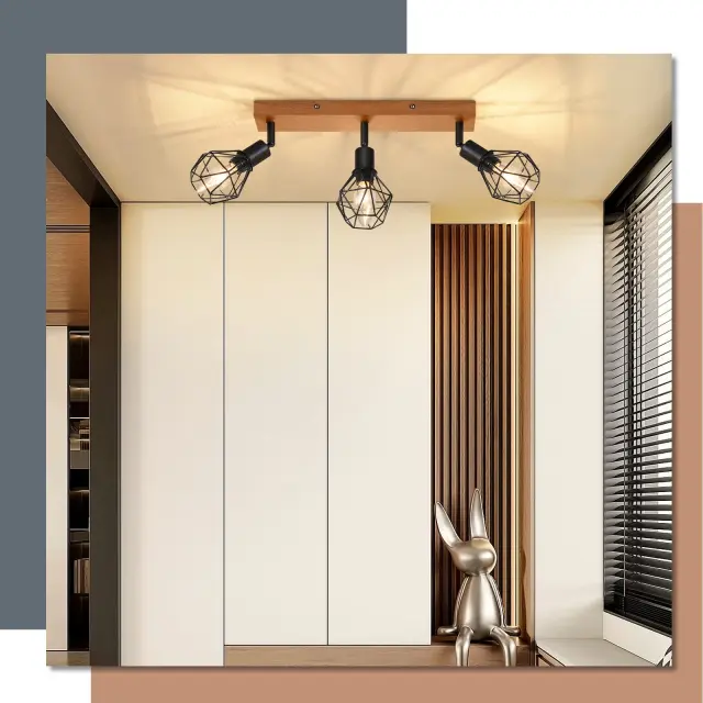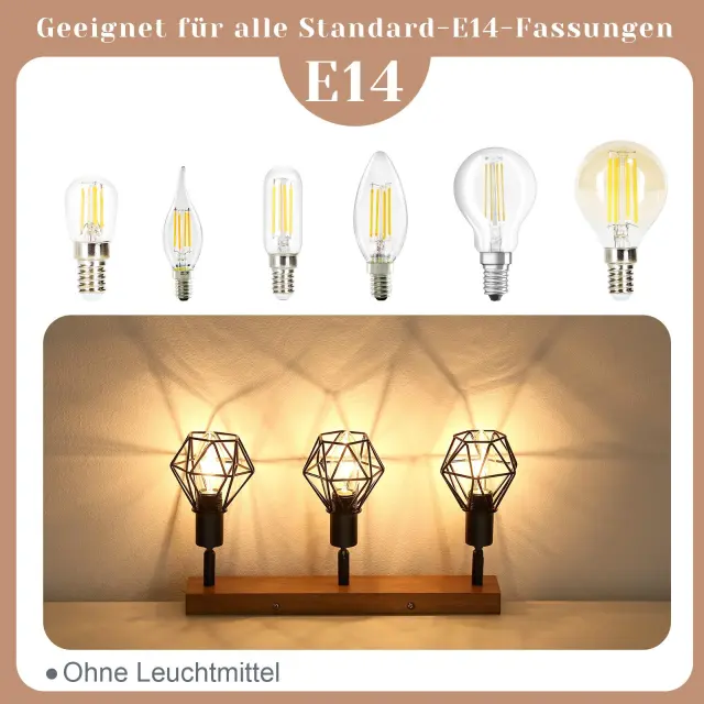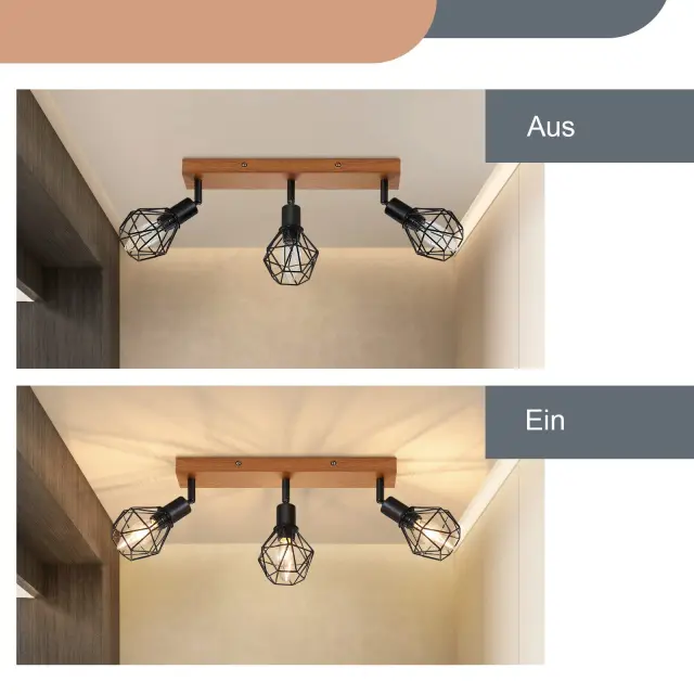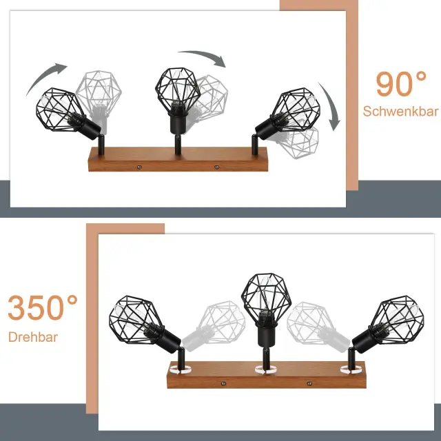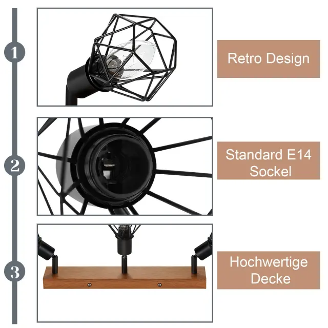 NETTLIFE 3 črne lesene stropne svetilke E14 retro kovinske nastavljive 350° notranje, MAX. 25W , brez žarnice