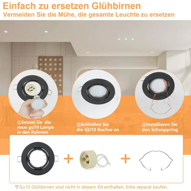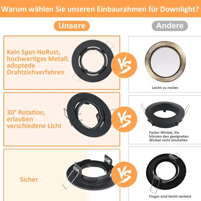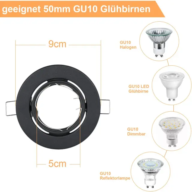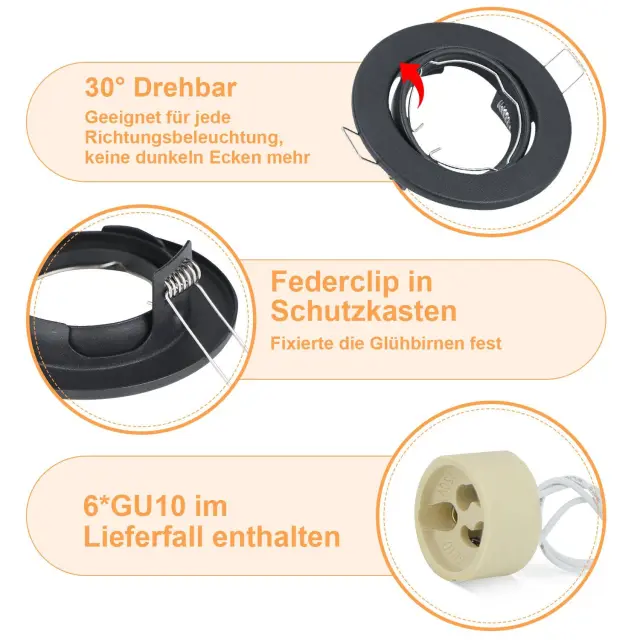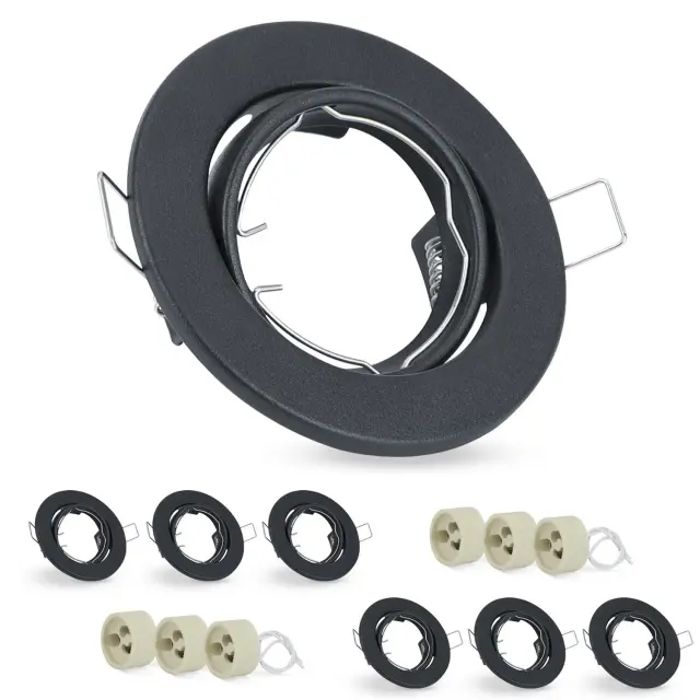 Tehnični podatki: Prejeli boste 6 črnih montažnih okvirjev s 6 keramičnimi okovi GU10 in fiksnimi vzmetmi. (Žarnica ni priložena). Priporočamo premer vgradne luknje približno 68–80 mm in globino vgradnje približno 75–90 mm. Ta vgradni reflektor je združljiv s katero koli svetilko s premerom 50 mm, ne glede na to, ali gre za LED ali halogensko svetilko. Varstvo okolja in prihranek stroškov: S temi vgradnimi reflektorji vam ni treba uporabiti celotnega reflektorja. To žarnico GU10 je mogoče enostavno zamenjati, kar prihrani čas in denar. Okvir ščiti svetilko pred prahom, vlago in drugimi nečistočami, kar podaljša življenjsko dobo svetilke in s tem prispeva k varstvu okolja. Nastavljiv snop svetlobe: Te vgradne reflektorje je mogoče zasukati za 30°, kar omogoča prilagajanje kota svetlobe po potrebi. To omogoča individualno nastavitev osvetlitve in ustvarja svetlo in vabljivo vzdušje v prostoru. Preprosta in moderna zasnova stropnega reflektorja se dobro ujema z notranjim slogom in prostor naredi lepši in prostornejši. Varen in zanesljiv: Naš vgradni okvir svetilke je izdelan iz debele kovine in je obdelan proti rjavenju. Okvir je odporen proti koroziji, stabilen in trden. Vgradni reflektor ščiti svetilko pred stikom in preprečuje električni udar. Uporaba montažnih okvirjev izboljša tudi odvajanje toplote in podaljša življenjsko dobo svetilke. Zato je naš vgradni okvir za svetilko vaša varna in zanesljiva izbira. Te 230V LED-downlights so primerne za dnevne sobe, spalnice, kuhinje, kopalnice, hodnike, hotele, pisarne, knjižnice, KTV-je, kleti, veleblagovnice in številne druge prostore, ki potrebujejo svetle stropne luči. Naš vgradni okvir za reflektor ima 2-letno garancijo. Če imate kakršna koli vprašanja, nas prosim kontaktirajte.