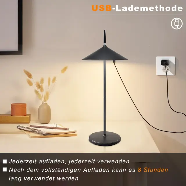 NETTLIFE Lampe de chevet tactile sans fil LED lampe de table noire dimmable 1800mhA rechargeable avec USB, LED intégrée en permanence, IP44