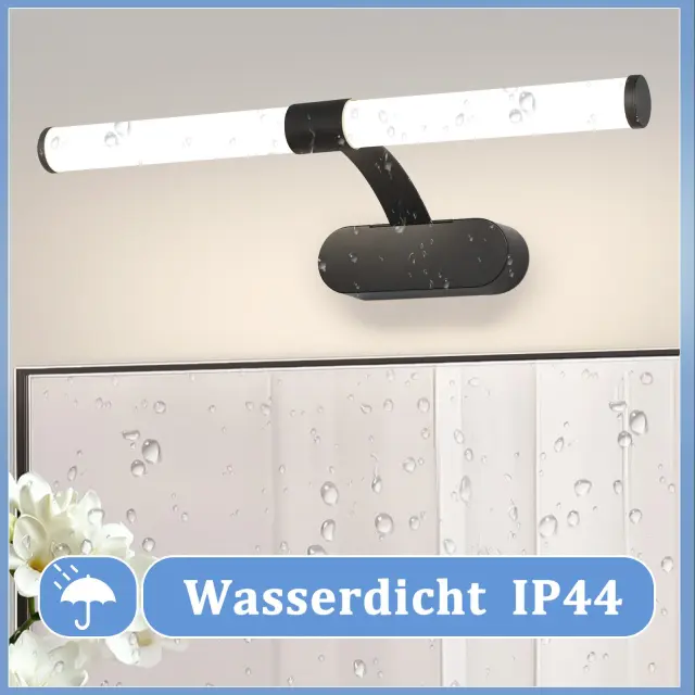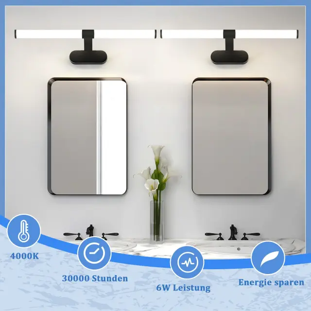 【Zaščita oči】Ta LED svetilka za ogledalo je idealna osvetlitev za ogledalo – z brezmigetno in brez bleščanja svetlobo za ogledalo je klasična kopalniška svetilka, ki izgleda odlično, ko je postavljena nad ogledalo, in predvsem zagotavlja dobro svetlobo brez bleščanja. Nevtralna bela barva svetlobe je idealna tudi za pravilno osvetlitev gledalca.