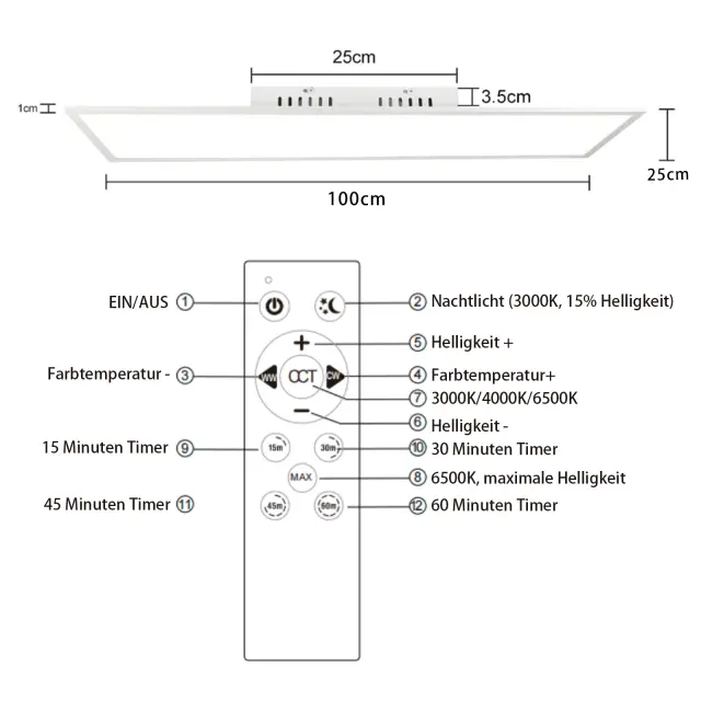 Zatemnitev in nadzor barvne temperature: LED plošča podpira zatemnitev, barvno temperaturo je mogoče nastaviti med 3000K in 6500K. Svetlost je mogoče nastaviti od 5 % do 100 %. Zahvaljujoč funkciji pomnilnika se zadnji način preklopa samodejno shrani. Hkrati je mogoče barvno temperaturo hitro spremeniti s stenskim stikalom.