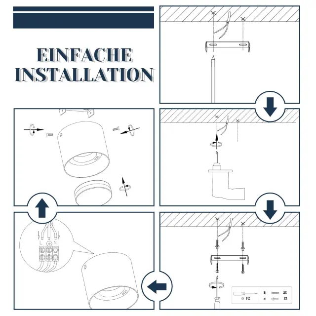 Enostavna namestitev: Ta stropna svetilka je idealna za tesne prostore in je praktična alternativa vgradnim reflektorjem. Za priključek 230 V ni potreben transformator. Z višino 10 cm in širino 8 cm je namestitev stropne svetilke enostavna: preprosto priključite kable in privijte vijake.