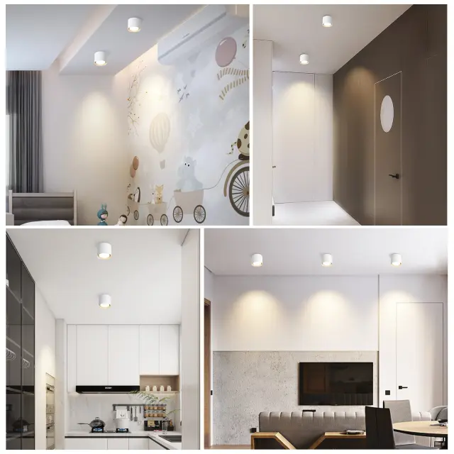 Vsestranskost: Zaradi površinske montaže je ta svetilka primerna za različne lokacije. Njena moderna in preprosta zasnova omogoča namestitev v dnevne sobe, hodnike, spalnice, otroške sobe, pisarne, garaže, vitrine in police.