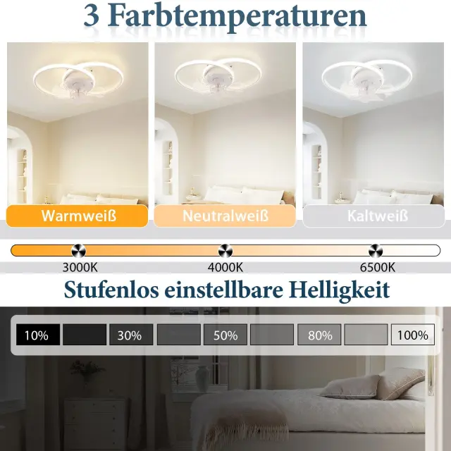 Večnamenski stropni ventilator z osvetlitvijo: Ta ventilatorska svetilka podpira 10 %–100 % neprekinjeno nastavljivo svetlost in 3 nastavljive barvne temperature: 3000K–4000K–6500K. Izberete lahko 6 hitrosti vetra, polurni časovnik in način nočne lučke. Pravo svetlobo in hitrost vetra lahko prilagodite svojim potrebam, kar vas bo pri delu ali igri naredilo bolj sproščene.