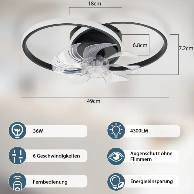Moderen dizajn: Ta LED stropna svetilka z ventilatorjem, zasnovana v edinstveni obliki dvojnega obroča, v edinstvenem modernem slogu ne le ustvari posebno vzdušje v vaši dnevni sobi in spalnici, temveč tudi bolje okrasi vaš dom. Poleg tega je LED stropna svetilka izdelana iz visokokakovostnih LED čipov, ki zagotavljajo visoko prepustnost svetlobe, brez utripanja, enakomerno in mehko svetlobo, kar lahko bolje zaščiti oči vas in vaše družine.