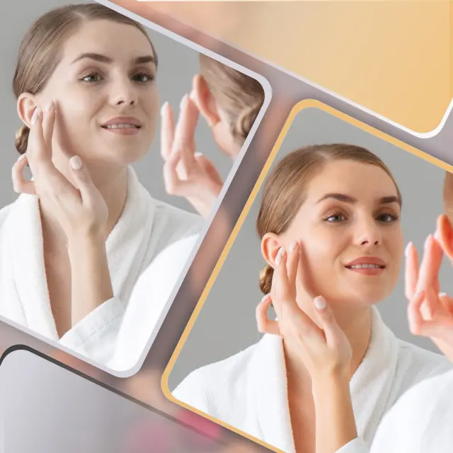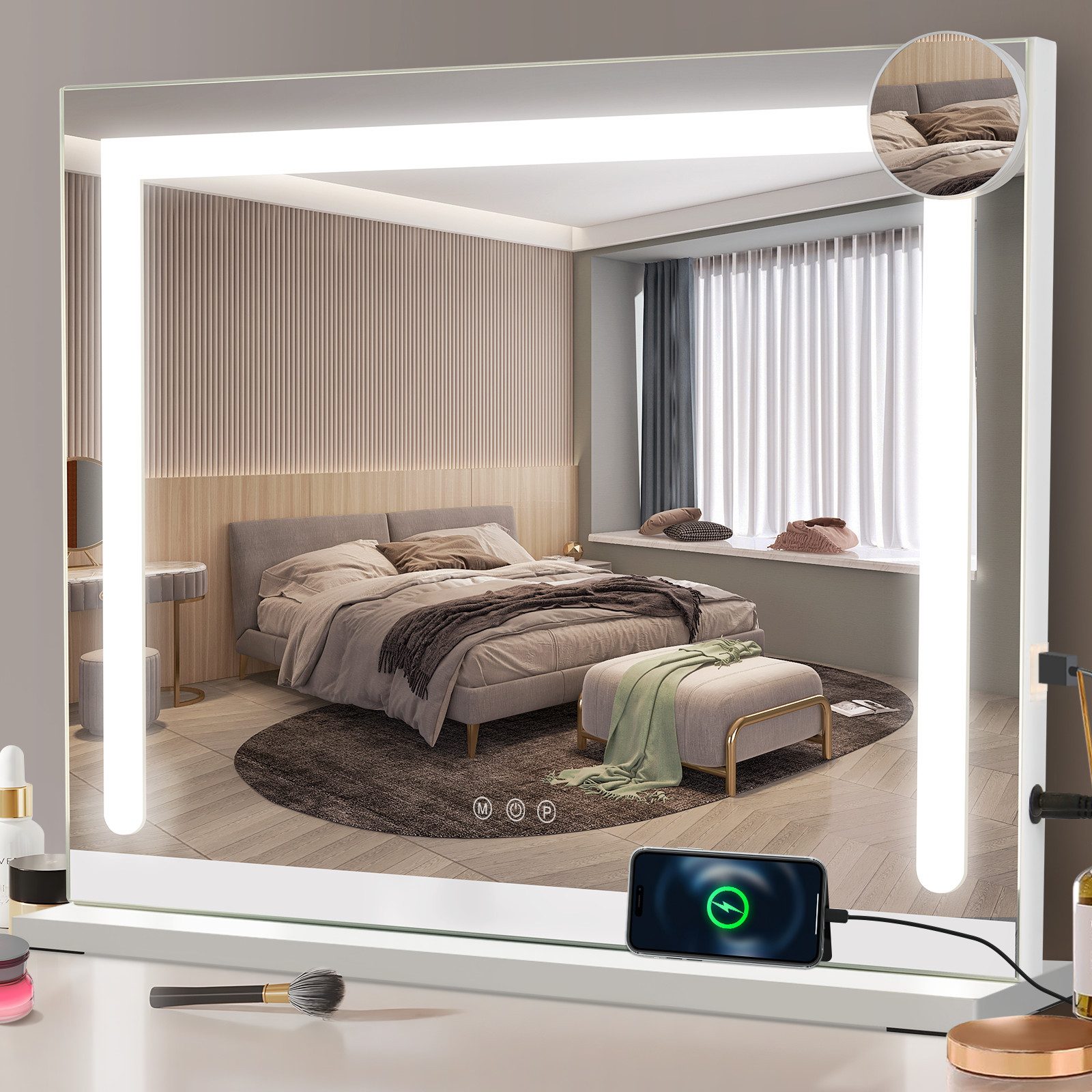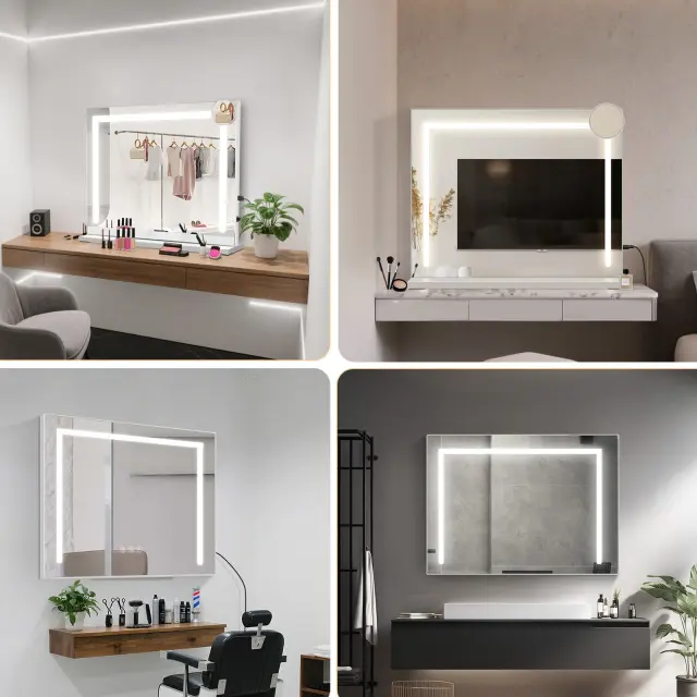 Profesionalna ličilna luč: Ta hollywoodski ličilni ogledal je opremljen z LED trakom, ki ponuja tri barvne temperature: toplo belo, nevtralno belo in hladno belo, ter nastavljivo svetlostjo (obseg barvnih temperatur: 3000–4000–6500 K). S preprostim pritiskom na gumb jo lahko enostavno zamenjate, kar ustreza vsem vašim potrebam po osvetlitvi – od spalnice do dnevne sobe – za optimalno nanosjenje ličil.
